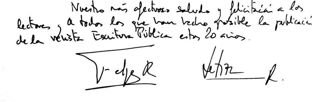 Mi felicitación más sincera a ESCRITURA PÚBLICA, así como también a su eficaz directora, Ana Togores, por estos veinte brillantes años, en la confianza de que seguirán muchos más, con competencia y rigor, al servicio de la mejor comunicación y del encuentro fructífero entre el NOTARIADO y la Sociedad.
