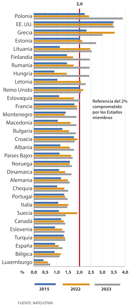 PORCENTAJE de lo que los actuales miembros de la OTAN vienen destinando a defensa sobre sus respectivos PIB (no incluye Islandia por ser país desmilitarizado). Comparativa entre los años 2015-2022 (fecha de la invasión rusa en Ucrania) y 2023.