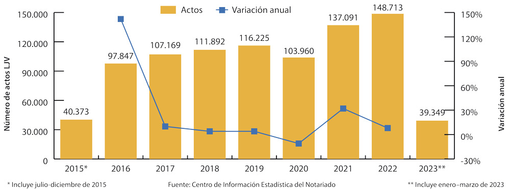 En cuanto a las cifras, la portavoz señala que “en 2021 se realizaron 137.091 actos; en 2022, 148.713; y en el primer trimestre de 2023, 39.349. Así, 2022 se convirtió en el año con mayor número de actos desde la entrada en vigor de la LJV, aumentando un 8% con respecto a 2021; y el número de actos del primer trimestre de 2023 fue un 16% mayor que el del mismo periodo de 2022, alcanzando los 39.349 actos registrados”.