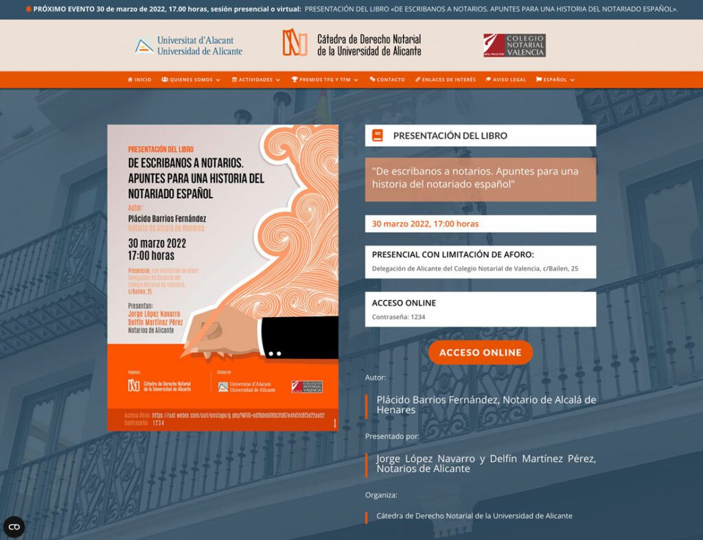 La Cátedra de Derecho Notarial de la Universidad de Alicante, creada recientemente por acuerdo entre la institución educativa y el Colegio de Valencia, inició sus actividades en enero, con una sesión virtual en la que se abordó la función notarial como salvaguarda legal en el otorgamiento del testamento y del acuerdo de apoyos.