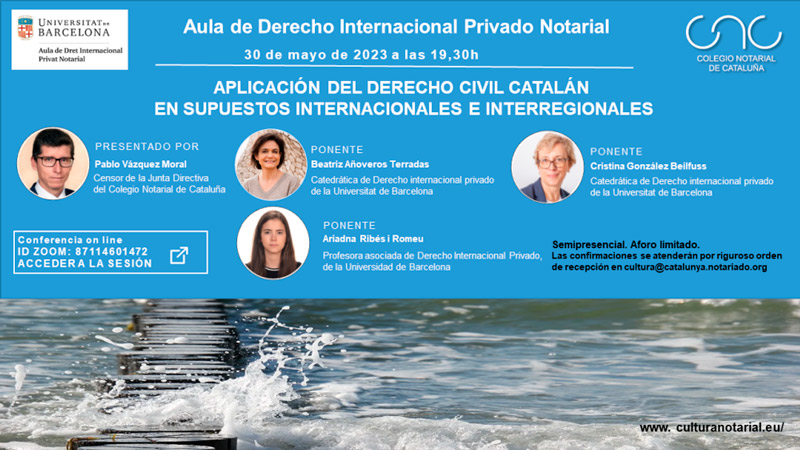 Posteriormente tuvo lugar el seminario virtual Aplicación del Derecho Civil catalán en supuestos internacionales e interregionales. La sesión fue presentada por Pablo Vázquez; y tuvo como participantes a Beatriz Añoveros y Cristina González Beilfuss, catedráticas de Derecho Internacional Privado de la Universitad de Barcelona; y Ariadna Ribés, profesora asociada de Derecho Internacional Privado, de la misma institución académica.