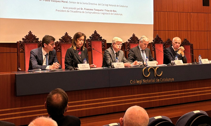 El Colegio Notarial de Cataluña y la Academia de Jurisprudencia y Legislación de Cataluña (AJILC) celebraron el 24 de abril la jornada Legítima y desheredamiento, en la sede colegial. El acto contó con las intervenciones del presidente de la AJILC, Francesc Tusquets; el presidente de la Audiencia Provincial de Barcelona, Antonio Recio; la vicedecana del Colegio Notarial de Cataluña, Raquel Iglesias; el catedrático de Derecho Civil de la Universitat Pompeu Fabra, Pablo Salvador; y el censor de la Junta Directiva del colegio notarial autonómico, Pablo Vázquez.