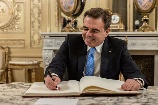 Margaritis Schinas firmando en el libro de honor del colegio.
