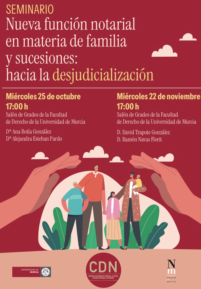El pasado 25 de octubre se celebró en la Universidad de Murcia la primera de las dos sesiones del seminario La función notarial en materia de familia y sucesiones: hacia la desjudicialización, organizado por la Cátedra de Derecho Notarial. Al encuentro, que tuvo lugar en el Salón de Grados de la Facultad de Derecho, asistió la decana del colegio murciano, Carmen Rodríguez, y participaron las notarias de Hellín y Moratalla, Ana Botía y Alejandra Esteban.
