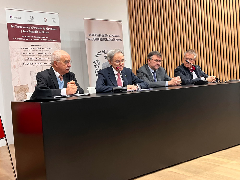El 10 de noviembre tuvo lugar la presentación de la obra Los testamentos de Fernando de Magallanes y Juan Sebastián de Elcano, en conmemoración del V Centenario de la primera vuelta al Mundo, en el Cristóbal Balenciaga Museoa de Guetaria (Guipuzkoa). En el acto participaron dos de los coautores, Borja Aguinagalde, director del Archivo Histórico de Euskadi, y Manuel Romero Tallafigo, catedrático emérito de Ciencias y Técnicas Historiográficas, acompañados por el decano del Colegio Notarial del País Vasco, Diego Granados, y el presidente del Consejo General del Notariado, José Ángel Martínez Sanchiz, autor del prólogo de la obra.
