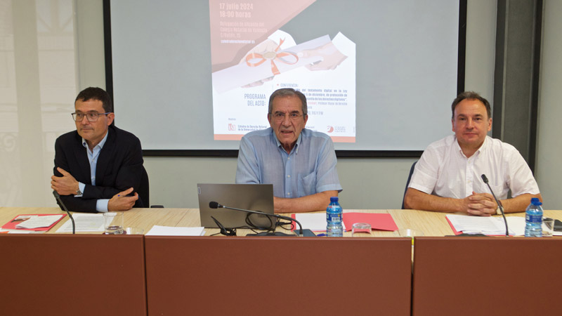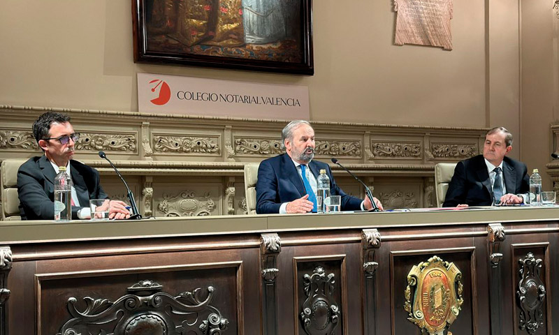 En la mesa acompañaron al catedrático el censor primero de la Junta Directiva del Colegio Notarial de Valencia, José Carmelo Llopis, y el notario y director de la cátedra, Ubaldo Nieto. A la cita asistieron catedráticos, economistas, juristas y representantes de colegios profesionales, instituciones académicas y autoridades políticas; entre ellos, la directora general de Justicia, Cristina Gil Fabregat; la directora general de la Agencia Tributaria Valenciana, Sonia Encarnación Díaz Español; el decano del Colegio de Abogados de Valencia, José Soriano Poves; y la presidenta del Colegio de Auditores de la Comunidad Valenciana, Lola Mor.