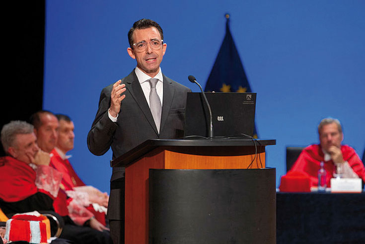 Tras el encuentro en el rectorado, José Carmelo Llopis impartió la lección magistral en el acto solemne de graduación de la Facultad de Derecho de la Universidad, bajo el título La tecnología y el derecho al servicio de la sociedad. Cerca de 400 alumnos atendieron a la cita, en la que el decano transmitió la importancia que las nuevas tecnologías tienen para el Notariado, que diariamente presta el servicio, la protección y la seguridad jurídica que necesita la ciudadanía: “El desarrollo tecnológico del Notariado ha dotado a los notarios de los más avanzados medios y sistemas de información para el intercambio seguro de información y la tramitación electrónica de documentos y datos”. En el acto también participaron la rectora de la UA y el decano de la Facultad de Derecho.
