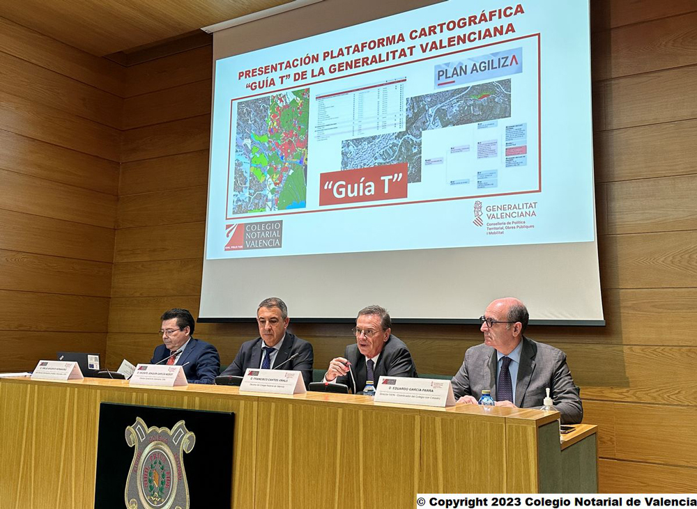 El director del Instituto Valenciano de Estudios Notariales y coordinador del Colegio con el Catastro, Eduardo García Parra; junto al jefe del servicio de Información y Análisis Urbanístico de la Consellería, Emilio Argentez, presentaron la plataforma cartográfica (que está disponible en la web de la Conselleria de Política Territorial, Obras Públicas y Movilidad).