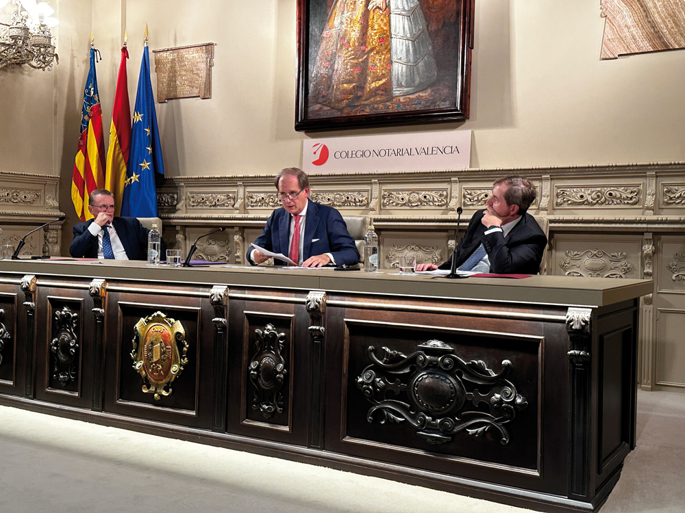 Durante la conferencia, que reunió a una amplia representación de autoridades del ámbito jurídico, político y académico, entre otros; Cazorla estuvo acompañado por el decano del Colegio Notarial de Valencia, Francisco Cantos, y por el director de la Cátedra de Derecho Notarial de la UCV y notario de Valencia, Ubaldo Nieto.