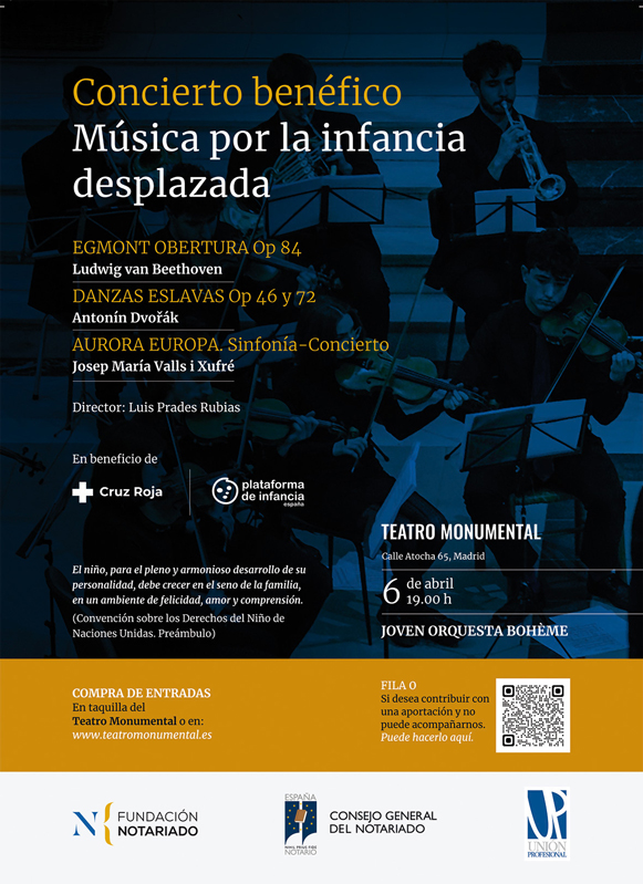 El Consejo General del Notariado, a través de sus dos fundaciones -Fundación del Notariado y Fundación Aequitas- junto a Unión Profesional, impulsa el concierto solidario Música por la infancia desplazada, en beneficio de Cruz Roja y la Plataforma de infancia. El evento se celebrará el 6 de abril a las 19:00 horas en el Teatro Monumental de Madrid, y contará con el patrocinio de Vodafone Business.