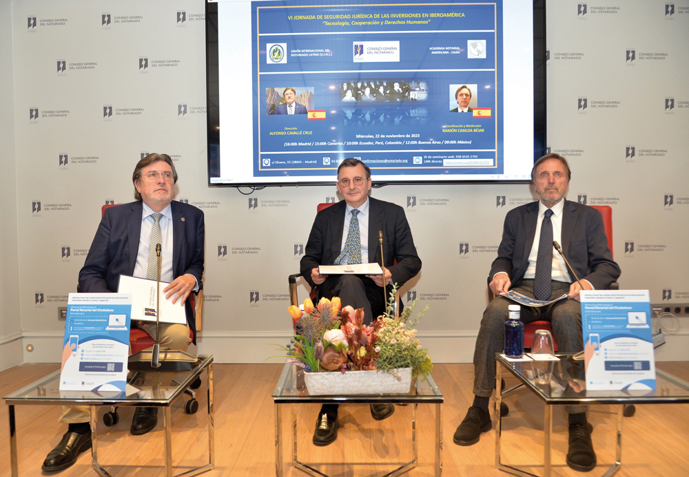 La importancia de generar confianza y disminuir los riesgos, que ha de ir de la mano con el profundo proceso de transformación social que trae consigo la digitalización, así como la defensa de los valores y principios de la justicia y los derechos de las personas, fueron los temas clave en torno a los que se articuló la VI Jornada sobre la Seguridad Jurídica de las Inversiones en Latinoamérica, celebrada en la sede del Consejo General del Notariado, bajo el título Tecnología, Cooperación y Derechos Humanos.