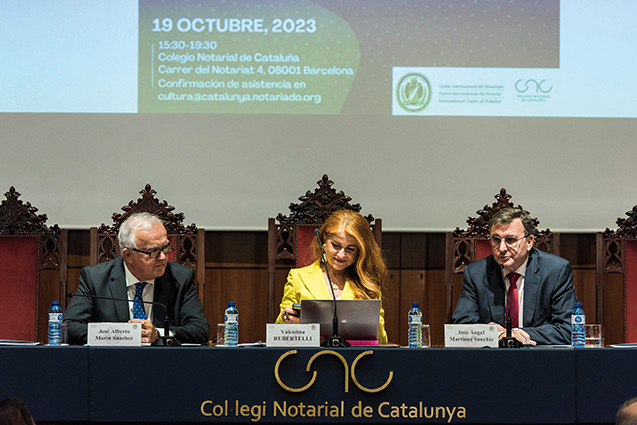 La ceremonia contó con la apertura a cargo de la presidenta de la Comisión de Asuntos Europeos de la Unión Internacional del Notariado (UNIL), Valentina Rubertelli, junto al presidente del Consejo General del Notariado, José Ángel Martínez Sanchiz y el decano del Colegio Notarial de Cataluña, José Alberto Marín.