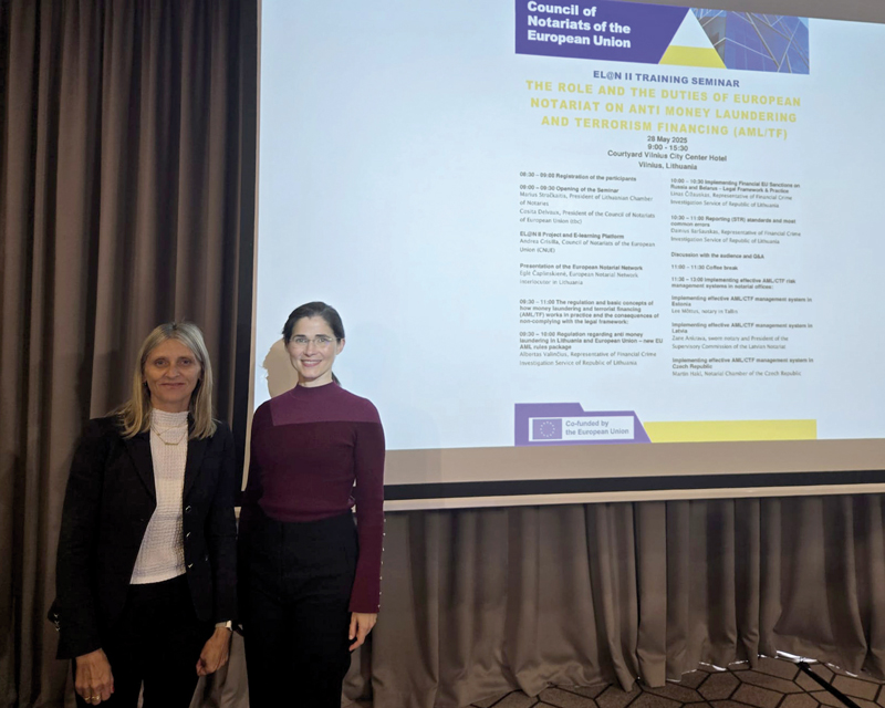 Los días 27 y 28 de mayo, el Consejo de los Notariados de la Unión Europea (CNUE) organizó en Vilna (Lituania) el seminario de formación EL@N II: El papel y las funciones del notariado europeo en la lucha contra el blanqueo de capitales y la financiación del terrorismo. En representación del Consejo General del Notariado (CGN) participaron en el encuentro la notaria María Belén Barrios y la colaboradora de Asuntos Internacionales del CGN en materia de blanqueo de capitales, Silvina Capello, quien intervino en la mesa sobre la implementación de sistemas eficaces de gestión del riesgo.