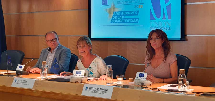 Se organizaron dos mesas de diálogo, la primera de ellas, introducida por la presidenta de Unión Profesional, Victoria Ortega, estuvo conformada por la secretaria general técnica del Ministerio de Trabajo y Economía Social, Consolación Rodríguez; y el director general del Servicio de Empleo Público Estatal, Gerardo Gutiérrez. También intervino por videoconferencia la vicepresidenta de la Comisión de Empleo y Asuntos Sociales del Parlamento Europeo, Alicia Homs.
