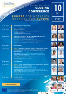 En el acto de clausura –que contó con la intervención de Álvaro Lucini, delegado del Notariado español en CNUE- se realizó un repaso de las principales conclusiones del programa. También se ofreció una visita virtual al Tribunal de Justicia de la Unión Europea (TJUE) donde un juez comunitario expuso algunos casos de jurisprudencia que pueden afectar a los notarios europeos. Por último, se debatió sobre la creciente digitalización de las actividades jurídicas, que se ha visto impulsada por la pandemia.