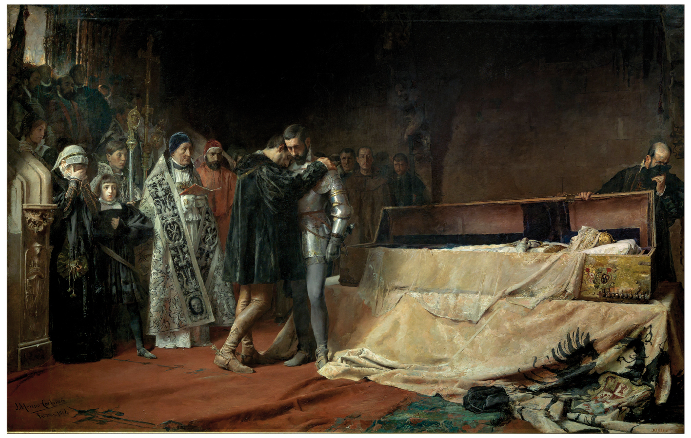 Su historia. Al morir Isabel de Portugal, esposa de Carlos V, su cadáver fue llevado a Granada. Allí, Francisco de Borja, encargado por el emperador de dirigir este traslado, mandó abrir el féretro antes de su enterramiento definitivo. Es aquí donde el relato literario se confunde con la historia. El joven, que siempre había sentido especial cercanía por la reina, queda desencantado al comprobar la putrefacción del cadáver. A esto alude el caballero que en el externo derecho tapa su nariz mientras él, desconsolado, se echa en brazos de su compañero. Los desencantos forman parte de nuestra vida cotidiana, pero aquí tuvieron una trascendencia mucho mayor: para Francisco de Borja supuso el principio de su conversión, como bien recuerda la cartela inferior del marco, que reproduce una de las sentencias más conocidas del que habría de fundar, años más tarde, la Compañía de Jesús: “Nunca más, nunca más servir a señor que se me pueda morir”. La gorra en el suelo, al lado del escudo, se convierte en la mejor imagen del abandono de lo terrenal. En manos del pintor, el asunto, de escasa relevancia para la historia de España, nos ofrece una lectura universal.