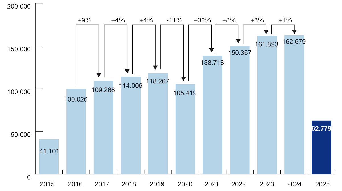 Desde julio de 2015 hasta junio de 2025, los notarios autorizaron un total de 1.264.453 actos de jurisdicción voluntaria, relacionados con sucesiones (948.287), familia (310.840), obligaciones y conciliación (5.326 entre ambos). El aumento de este tipo de actos ha sido constante año a año, con la excepción del parón registrado en 2020 a causa de la pandemia.