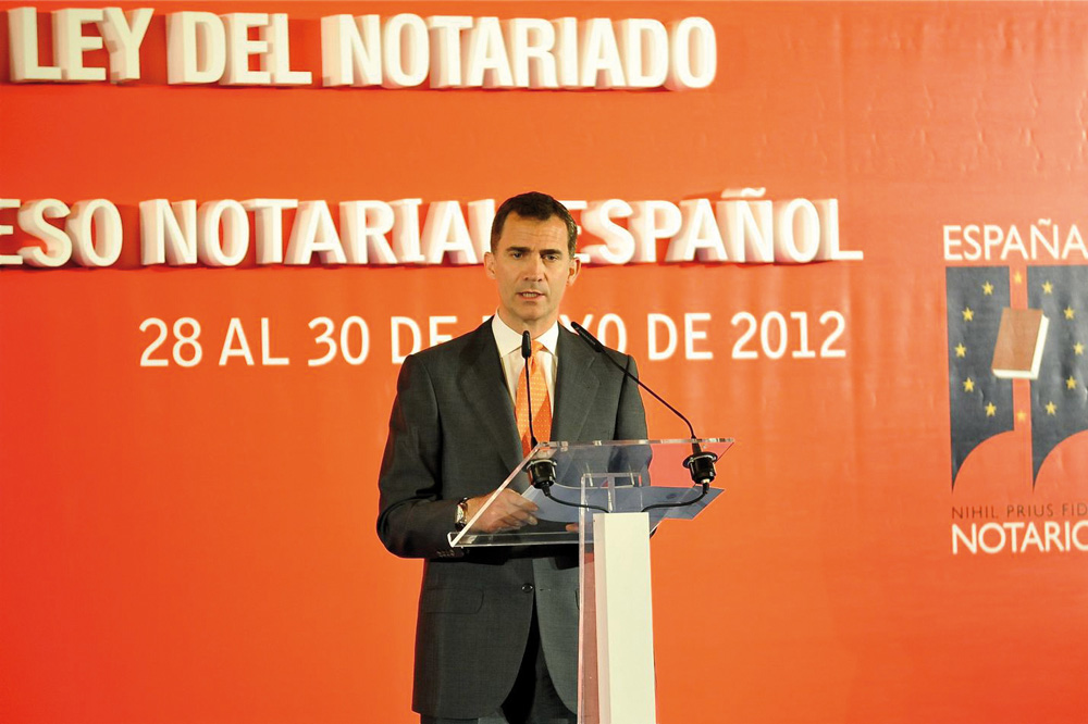 Don Felipe de Borbón y Grecia quiso dedicar “un merecido y específico tributo de gratitud y admiración a todos los notarios españoles por su rigurosa preparación, reconocida autoridad jurídica y encomiable profesionalidad, imparcialidad y dedicación”, señalando “ante la sociedad, la tradicional y creciente importancia de la función notarial, su indudable contribución a la paz social y su trascendental dimensión económica y social, al constituir un pilar esencial para la seguridad del tráfico jurídico en nuestra sociedad”. El entonces Príncipe de Asturias recordó que “corresponde al notario ejercer un control de legalidad en los documentos que autorice y buscar una solución equilibrada que garantice la seguridad jurídica y el respeto a la libertad contractual desde una posición de independencia e imparcialidad, de equidistancia respecto de los intereses de las partes”, lo que “explican el reconocimiento y alto prestigio acumulados por los notarios en los países representados en este congreso”.