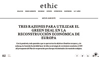 -Ethic: Tres razones para utilizar el Green Deal en la reconstrucción económica de Europa. Con la pandemia, los objetivos climáticos europeos han pasado a un primer plano en la estrategia de crecimiento económico, y un tercio del presupuesto del Plan de Recuperación irá destinado a la transición ecológica.