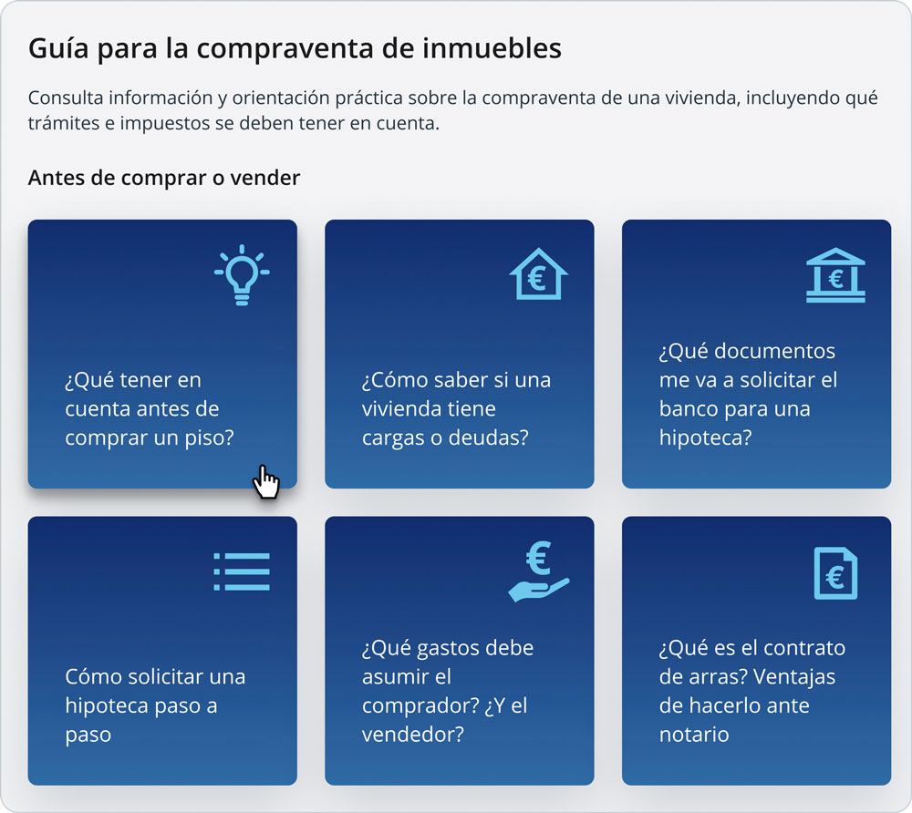 El portal cuenta con otras dos secciones clave para tomar decisiones bien fundamentadas sobre la compra o venta de un inmueble. La primera sección reúne utilidades o herramientas prácticas que permiten desde el cálculo de la hipoteca o la estimación del esfuerzo de renta necesario para la adquisición de una vivienda, hasta la posibilidad de localizar y seleccionar al notario que nos asesorará y gestionará los trámites necesarios para la compraventa. Esta sección se completa con una guía detallada para afrontar con garantías todo el proceso.