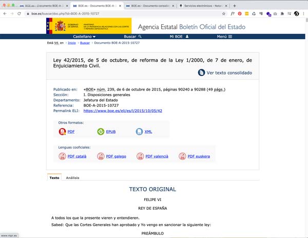 La Ley 42/2015 de reforma de la Ley de Enjuiciamiento Civil –vigente desde el 1 de enero de 2016–.