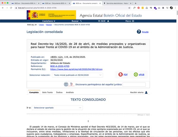 Real Decreto-ley 16/2020, de 28 de abril, de medidas procesales y organizativas para hacer frente al Covid-19 en el ámbito de la Administración de Justicia.