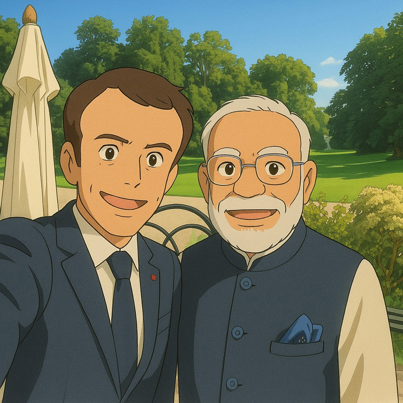 En tiempos recientes el estudio ha estado en boca de todos. Y es que diversas herramientas de inteligencia artificial, entre ellas ChatGPT, permiten recrear su estética y encanto visual con solo subir una imagen y dar una simple instrucción o prompt. De esta forma, cientos de miles de personas han utilizado ya estas herramientas para transformar sus selfies, mascotas, escenas y paisajes familiares al estilo “Ghibli”. Sirva como ejemplo esta imagen difundida por la embajada francesa en la India de Enmanuel Macron, presidente de la República, y Narendra Modi, primer ministro del país asiático.
