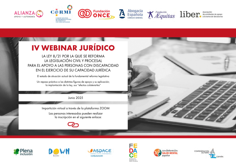 A lo largo del mes de junio tuvo lugar el IV Webinar Jurídico sobre la Ley 8/2021, organizado por la Fundación ONCE, CERMI estatal, el Consejo General de la Abogacía, la Fundación Aequitas y la Alianza Apoyo y Autonomía bajo el epígrafe El estado de situación actual de la fundamental reforma legislativa. Un repaso práctico a las distintas figuras de apoyo y su aplicación, la implantación de la ley y sus efectos colaterales. El seminario contó con la asistencia de más de mil profesionales, entre operadores jurídicos y personal de entidades de atención a personas con discapacidad.