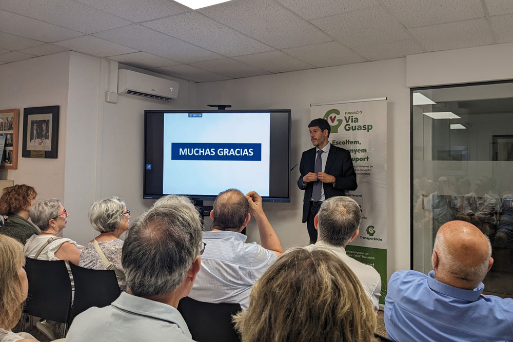 El delegado autonómico de Aequitas en Cataluña, Valero Soler, impartió a mediados de junio una charla informativa en la sede barcelonesa de la Fundació Vía Guasp para trabajadores de la institución y familiares de personas con enfermedades mentales. El notario abordó la manera de proteger el patrimonio presente y futuro mediante figuras jurídicas como el nombramiento de administrador en testamento o la asistencia.