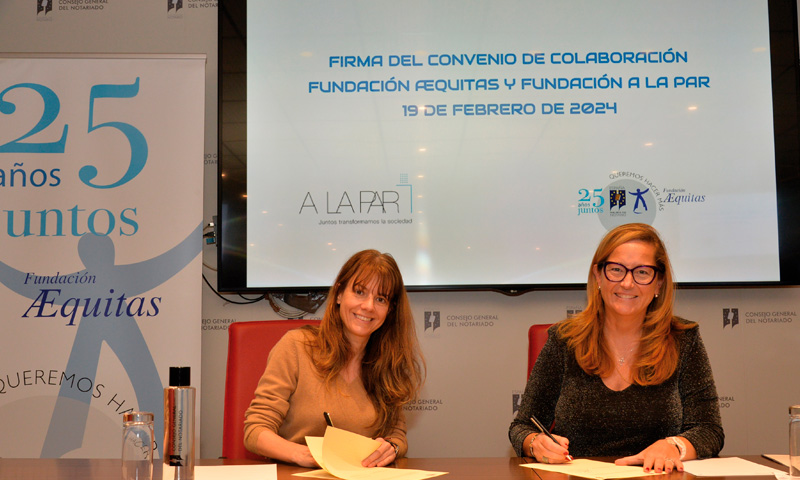 La directora de la Fundación Æquitas, Almudena Castro-Girona, y la presidenta de la Fundación A LA PAR, Almudena Martorell, suscribieron en el mes de febrero, en la sede del Consejo General del Notariado, un convenio marco de colaboración entre ambas entidades con el objetivo de desarrollar actividades formativas y de sensibilización en cuestiones que contribuyan a eliminar las barreras para las personas con discapacidad en el pleno ejercicio de sus derechos.