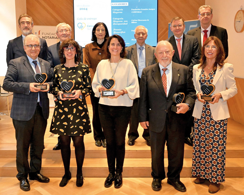 El 27 de noviembre tuvo lugar la gala de entrega de los premios Cerca de los que están cerca 2024, promovidos por Fundación Notariado y Fundación Aequitas, con la colaboración de la Plataforma de Mayores y Pensionistas. En esta tercera edición fueron galardonadas, por su trabajo en pro del bienestar de las personas mayores, la Fundación Grandes Amigos y la Confederación Estatal de Mayores Activos; y por su contribución en favor de las personas con discapacidad, Cáritas Diocesana de Bilbao.