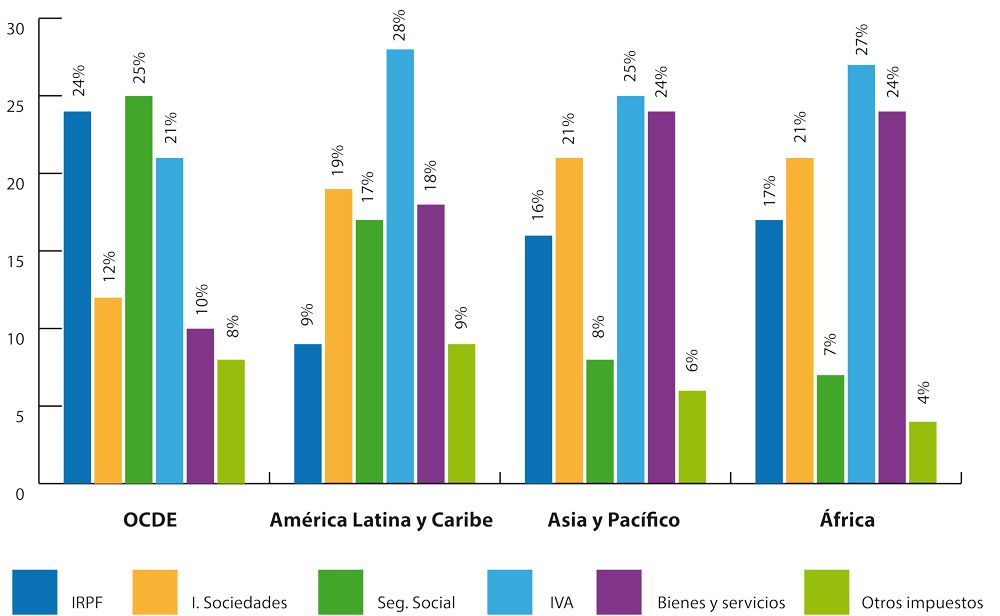 En África, América Latina y Asia las economías dependen más del IVA, del impuesto de sociedades y del impuesto a bienes y servicios, que del IRPF o de los pagos a la seguridad social. Sin embargo, en los países de la OCDE, de media, predominan las contribuciones a estos dos últimos. La conclusión se basa en los valores promedio, aunque hay casos de diferencias enormes ente países. Por ejemplo, mientras que la media de ingresos tributarios de la seguridad social en Asia y el Pacífico es del 8%, en Japón, que pertenece a esa región, es del 39%.