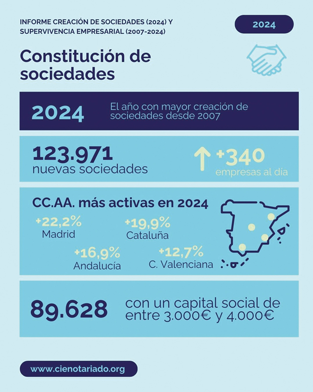 El pasado 11 de marzo, el Consejo General del Notariado publicó el informe Creación de sociedades en 2024 y supervivencia empresarial entre 2007 y 2024, realizado con datos del Centro de Información Estadística del Notariado. Según este estudio, 2024 fue el año en el que se crearon más empresas desde 2007, superándose por primera vez desde la pandemia de la Covid-19 las cen mil sociedades.