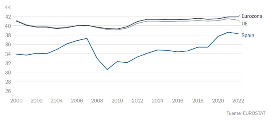 • La presión fiscal en España, tras aumentar 8 puntos porcentuales desde 2009, se sitúa en el 38% del PIB, frente al 41% de media ponderada de la Unión Europea (27) y al 42% de los países que integran la zona euro.