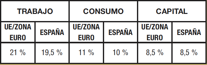 • Las diferencias fiscales entre España y la media ponderada europea se centran en la imposición recaudatoria sobre el trabajo, sobre todo, y el consumo, y no sobre los impuestos aplicados al capital.