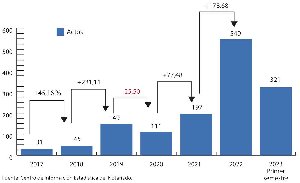 Los documentos de voluntades anticipadas, la cesión de bienes a cambio de alimentos y/o renta, y las hipotecas inversas desde 2021 han tenido, como conjunto, un crecimiento sostenido, registrando en 2022 una subida del 34% comparándolos con el año anterior, para llegar a un total de 66.895 expedientes. De manera particular el mayor aumento se dio en el grupo de las hipotecas inversas, procedimiento que ha cobrado relevancia en los últimos años, habiéndose registrado en 2017 solamente 31 actos mientras que en el primer semestre de 2023 se autorizaron 321 hipotecas inversas. En 2022, con respecto a 2021, las hipotecas inversas tuvieron un avance del 178,7% aumentando de 197 a 549 actos autorizados. Los documentos de voluntades anticipadas registraron en 2022 un aumento del 34,5% con respecto a 2021 (pasando de 9.839 a 13.230 actos), mientras que la cesión de bienes tuvo una caída del 18,7% entre 2022 y 2021 (pasando de 642 a 522 actos).