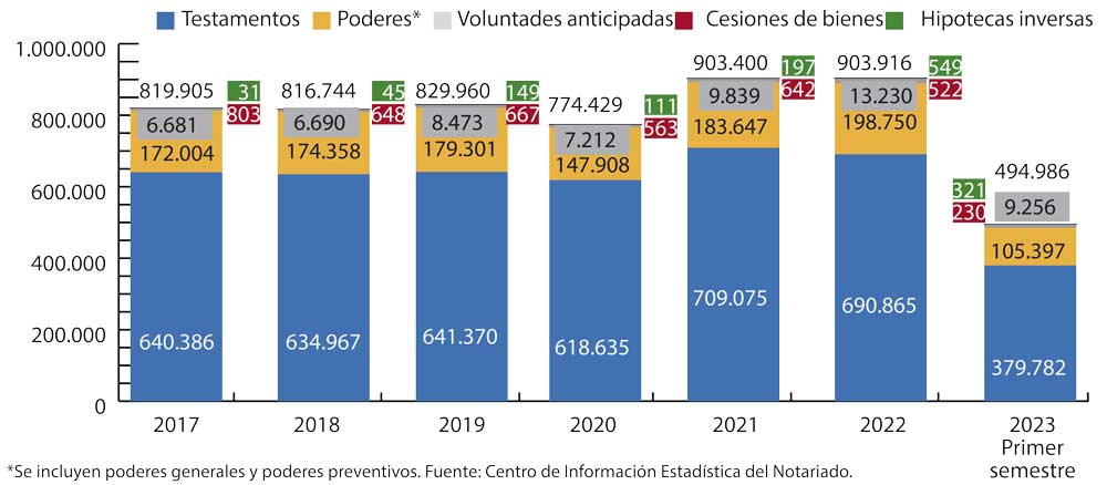 Los notarios han autorizado, desde enero de 2017 y hasta junio de 2023, 5.543.340 testamentos, poderes generales y preventivos, voluntades anticipadas, cesión de bienes e hipotecas inversas, llegando en 2022 al máximo anual, donde se realizaron 903.916 actos.