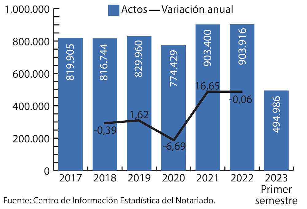 Si bien se ha registrado un aumento en el número de actos autorizados desde 2017, la tendencia ha sido desigual ya que más allá del descenso ocasionado por el parón del año 2020 debido a la Covid 19, en 2018 se registró una caída (-0,4%) y en 2022 el aumento fue tímido (0,06%). Entre 2017 y 2022 se observa un crecimiento modesto del 10% pasando de 819.905 actos en 2017 a 903.916 en 2022. El año 2023, sin embargo, muestra un incremento, con el mejor primer semestre desde 2017, llegando a los 494.896 actos, lo que significa un crecimiento del 6,2% con respecto a 2022, año en el que se registraron 465.963 expedientes.