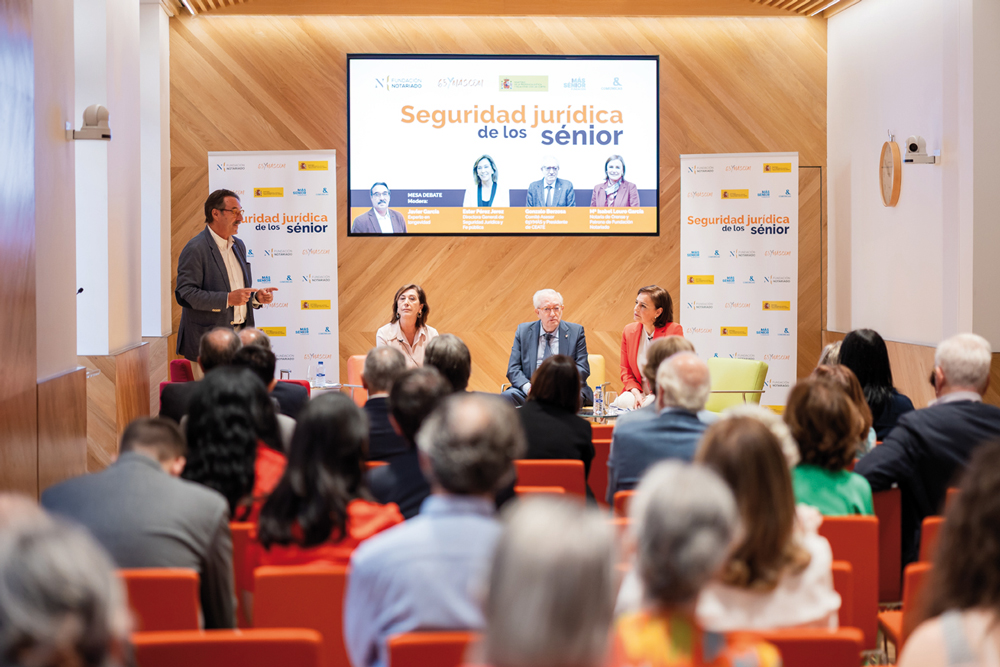 La jornada Seguridad jurídica de los sénior, organizada por Fundación Notariado y 65YMÁS, en colaboración con el Consejo General del Notariado y el Colegio Notarial de Madrid, contó con la presencia de la presidenta de Fundación Notariado y del Consejo General del Notariado, Concepción Pilar Barrio Del Olmo; del Secretario de Estado de Justicia, Manuel Olmedo; del presidente de 65YMÁS, Fernando Ónega; y del director general de Fundación Notariado, Raimundo Fortuñy. En la mesa de debate, moderada por Javier García Pérez, experto en longevidad, intervinieron Ester Pérez Jerez, directora general de Seguridad Jurídica y Fe Pública; Gonzalo Berzosa, del comité asesor de 65YMÄS y presidente de CEATE y María Isabel Louro García, notaria de Orense y patrona de la Fundación Notariado.