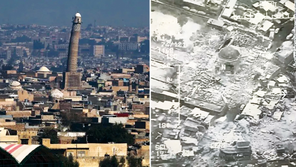 La gran mezquita de Al-Nuri, en Mosul, antes y después de la destrucción. Estados Unidos e ISIS culpan al otro S bando de su pérdida.
