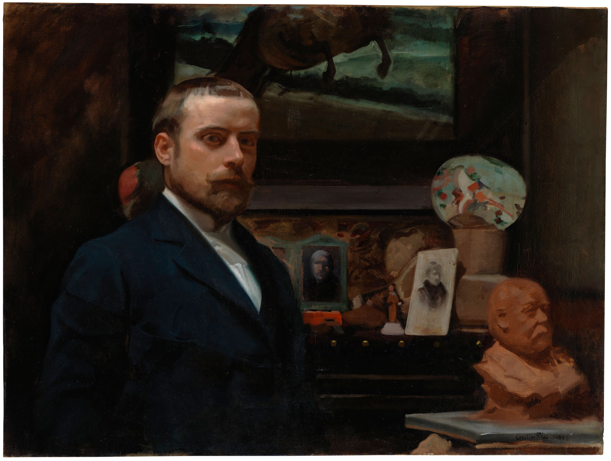 Por un lado, el carnal, al cual alude mediante tres efigies: su tía Josefa Pla, en una imagen coloreada debajo del cuadro; su madre María Gallardo en una fotografía; y, sobre una mesa, un busto en barro de su padre Sebastián. Algunas fotografías de su estudio que ingresaron con la donación demuestran que Pla gustaba de colocar imágenes de sus familiares y amigos sobre un mueble y apoyadas en la pared o en los propios cuadros, como sucede aquí con las de su madre y su tía. De esta forma, el joven se muestra agradecido a sus progenitores y a su tía, cuya ayuda resultó indispensable tras su llegada a Madrid desde Valencia.