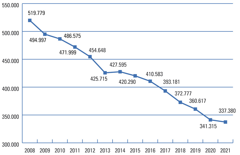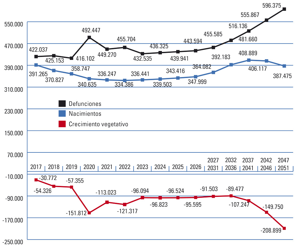 Fuente: 2017-2021, Estadística de Movimiento Natural de la Población (datos provisionales para 2021). Para los años 2027 a 2051 se ofrecen datos medios anuales del quinquenio.