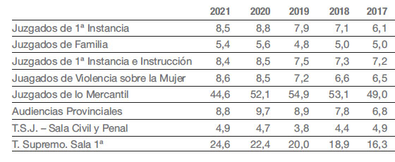 Por tanto, en contra de lo que percibe la opinión pública, la Justicia española no carece de medios. Sin embargo, sus indicadores de eficiencia no mejoran como cabría esperar. La denominada “tasa de congestión” (resultado de dividir la suma de los asuntos pendientes al comienzo del año más los ingresados entre los resueltos a lo largo del año) ha ido en aumento desde 2015. En líneas generales, también ha crecido el tiempo medio que los asuntos están en los juzgados con respecto a hace cincos años, con la única excepción de los juzgados de lo Mercantil que, aun así, tienen plazos muy superiores al resto.