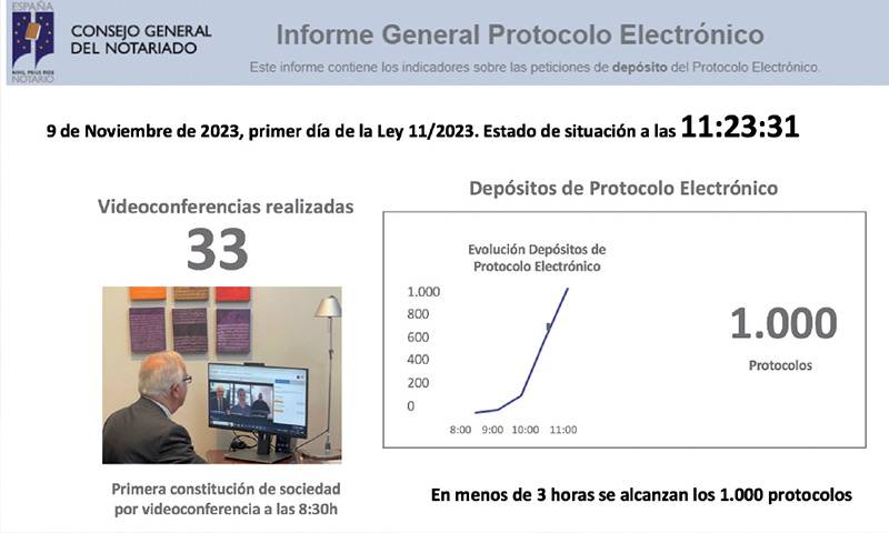 El 9 de noviembre entraron en vigor las medidas de digitalización notarial incluidas en la Ley 11/2023, que han hecho posible la creación del protocolo electrónico notarial. Un hecho histórico que agilizará el intercambio de información y generará de forma casi inmediata millones de copias electrónicas de los documentos notariales.
