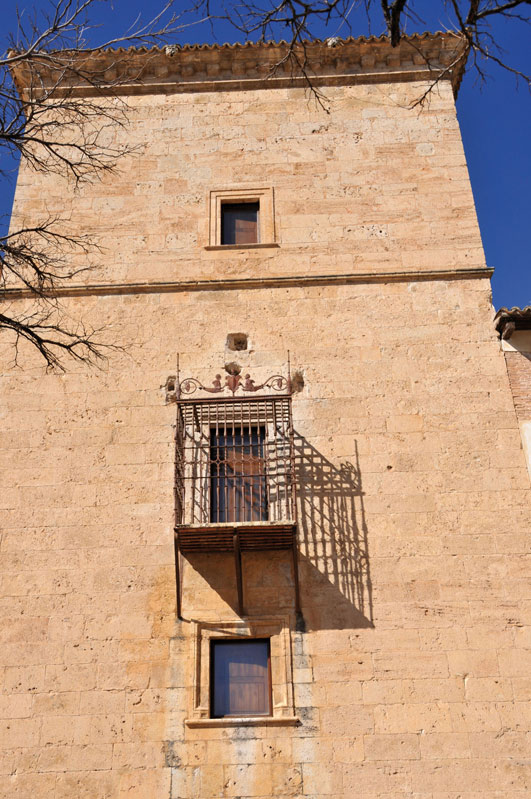 Quizás sorprenda al observador que un edificio renacentista, de fachada sobria y llamativa portada principal, tenga un balcón enrejado en su torre frontal derecha, a modo de pegote que parece no encajar con el conjunto. Tiene una explicación: es el balcón de la habitación donde la Princesa de Éboli estuvo encerrada los últimos años de su vida. Se podía asomar a él, sí; pero solo una hora al día (de ahí el nombre de Plaza de la Hora). Las rejas las mandó poner Felipe II para que la mujer no pensase en fugarse, después de que Antonio Pérez, quien fuera secretario del rey y colega de conspiraciones de la princesa, pusiera tierra de por medio para refugiarse en Aragón, una vez descubiertos los tejemanejes de la pareja.