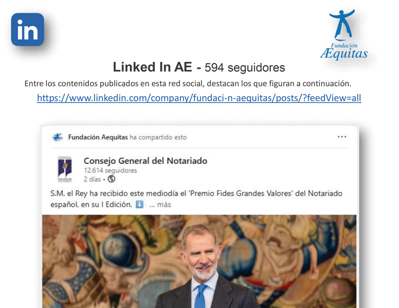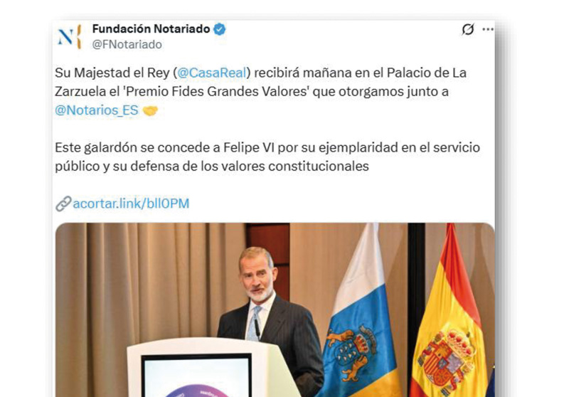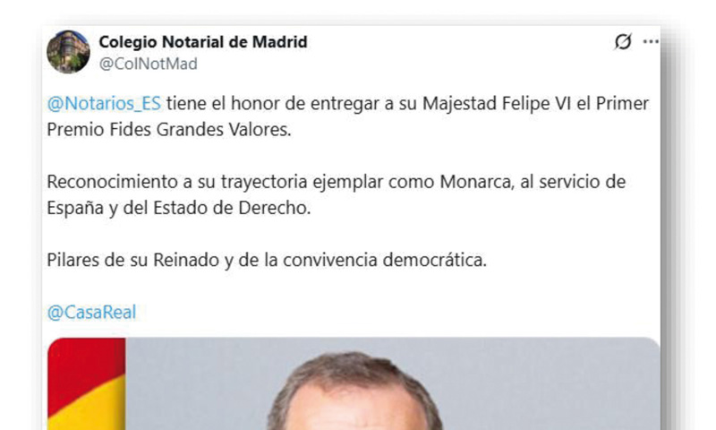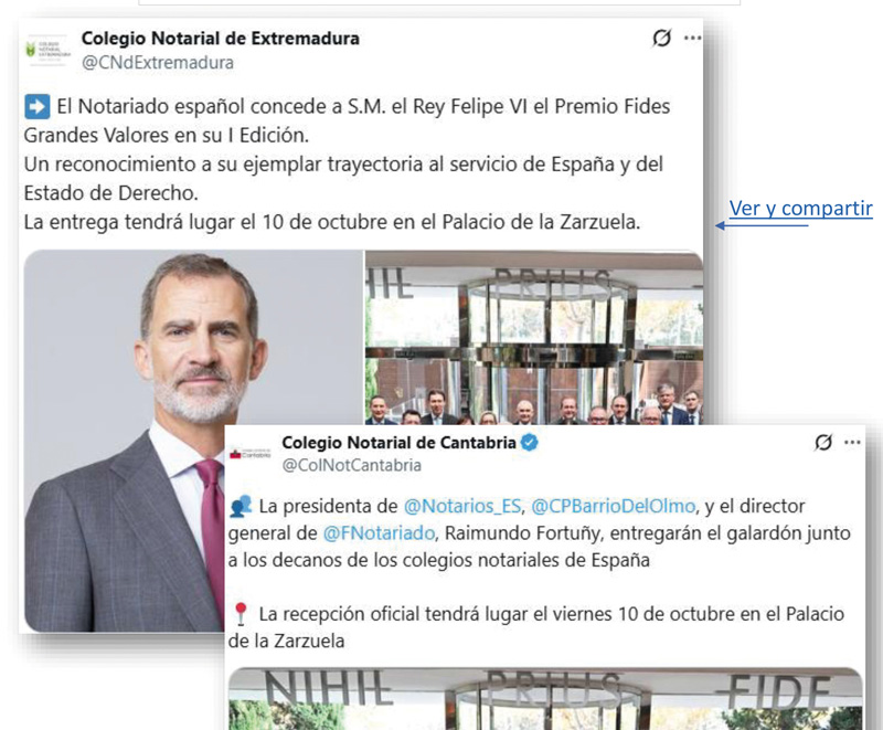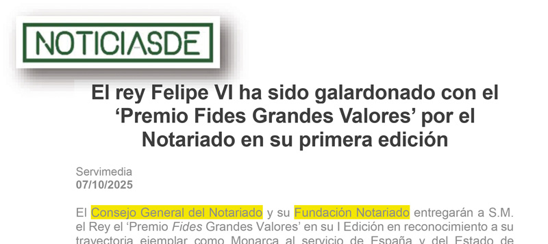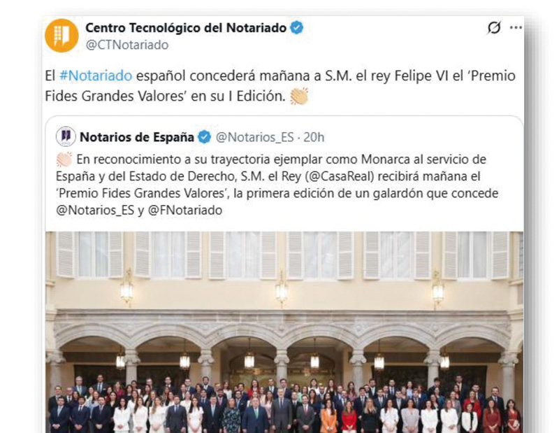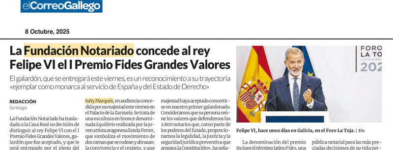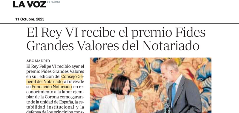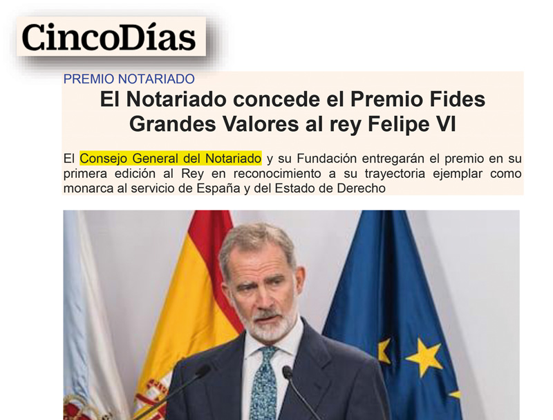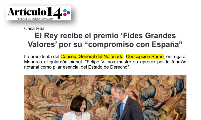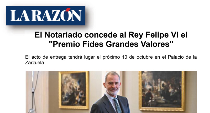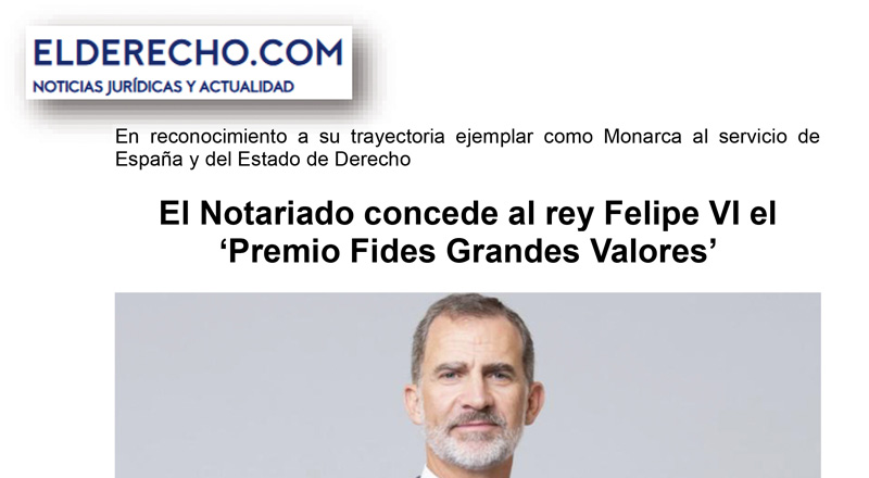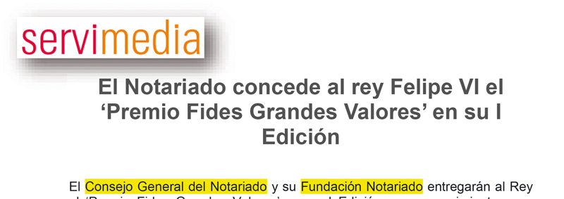 Numerosos medios de comunicación se hicieron eco del ‘Premio Fides Grandes Valores’ concedido a S.M. el Rey Felipe VI por la Fundación Notariado. La noticia fue difundida tanto por la Casa Real como por el Consejo General del Notariado, la Fundación Notariado y los Colegios Notariales, en sus páginas web y en sus redes. Televisión Española entrevistó a la presidenta del Notariado, Concepción Pilar Barrio Del Olmo, así como el diario Artículo 14. Otros Medios, impresos y audiovisuales, tanto nacionales como autonómicos, económicos y jurídicos, también le dedicaron un amplio espacio.