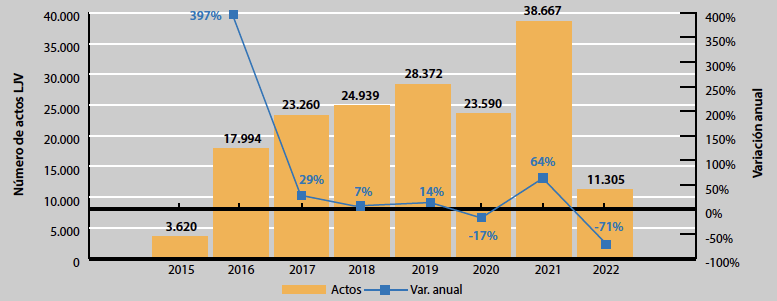 Número de actos asociados a la LJV y variación interanual por año, 2015 – 2022 * Incluye julio-diciembre de 2015 **Incluye enero-marzo de 2022