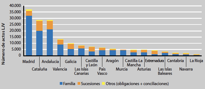 A nivel autonómico la comunidad autónoma que ha registrado un mayor número de actos asociados a la LJV desde su publicación ha sido Madrid, con un total de 36.972, seguida de Cataluña, con 28.652 actos, y Andalucía con 28.505. De acuerdo con el tipo de acto, se observa a nivel autonómico el mismo patrón que a nivel nacional, con los actos de familia siendo el grupo mayoritario en todas las comunidades, a excepción de Extremadura y Castilla y León, donde los actos de sucesiones fueron mayoría. Madrid (el 87% del total de 36.972), Murcia (76% del total de 5.084) y Andalucía (75% del total de 28.505) han sido las comunidades donde los actos de familia han tenido un mayor peso desde el inicio de la aplicación de la LJV, mientras que Extremadura (69% del total de 4.116), Castilla y León (50% del total de 7.303), y Galicia (42% del total de 9.888) han sido donde los actos de sucesiones han alcanzado su mayor importancia relativa.